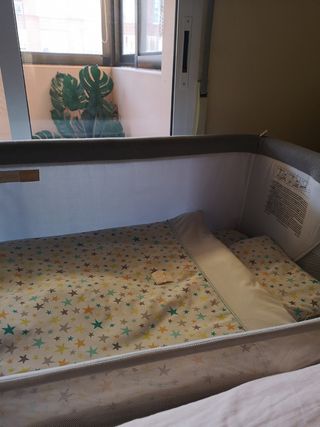 Cuna de colecho en perfecto estado, utilizada solo 2 meses. Ideal para tener al bebé cerca. - Estructura de madera y textil. - Laterales de malla transpirable. - Incluye colchón y también mosquitera.