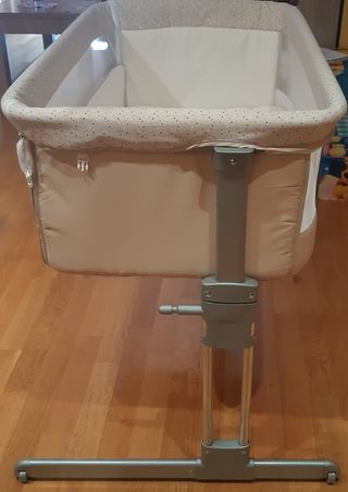 Cuna de colecho Chicco modelo Next 2 me. Está como nueva, salvo una cremallera del lado derecho que está rota tal y como se ve en la foto, pero no resta funcionalidad.Se entrega lavada, limpia y con todos los accesorios, colchón, instrucciones funda y correas para atar si se quiere al canapé de la cama.Se puede regular la altura de cada lado individualmente; y abrir o cerrar la parte delantera para hacerla colecho ○ cuna normal. Las patas se pueden doblar para acercarla más aún a la cama.