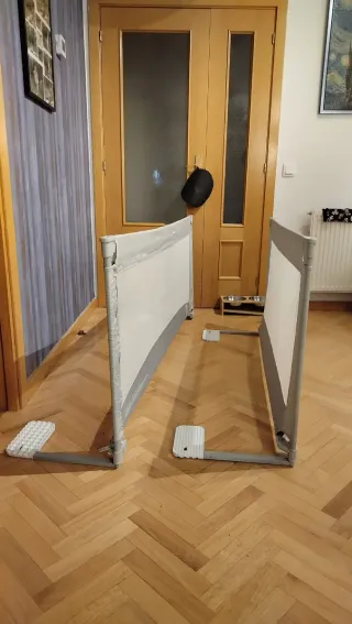 Se venden dos vallas de seguridad para cama de matrimonio. Son ideales para evitar caídas durante la noche. Una mide 190 cm de largo, para el lateral. La otra 150 cm, para los pies. Ideal para colecho. Soporte para poder unirlas. Cada una 25€. Las 2 por 40€. - Color gris. - Material de malla transpirable y estructura metálica.