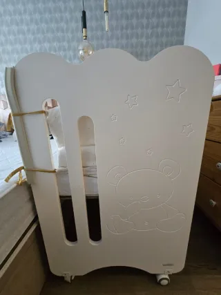 Cuna colecho de madera color blanco Con dibujo de osito Se puede hacer tipo colecho con la cama o cuna independiente. Tiene ruedas con freno - Medida de 120cm. - Lateral con barandilla que se puede quitar - No incluye colchon ni protectores