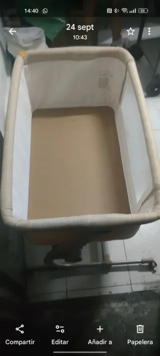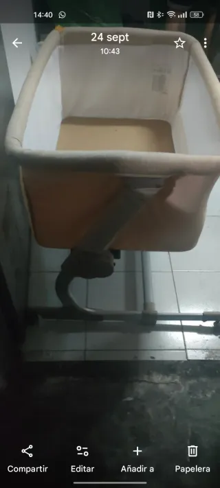 Cuna de colecho Chicco Next2Me Essential en color beige, en muy buen estado. El único detalle es que una cremallera no se cierra (se puede ver en la foto). Incluye colchón con dos sábanas. Como regalo, se añade un colchón adicional de espuma más alto y cojines de apoyo para el bebé. Diseñada para mantener la cercanía con el bebé durante la noche. • Estructura metálica. • Laterales de malla transpirable. • Ruedas para facilitar el movimiento.