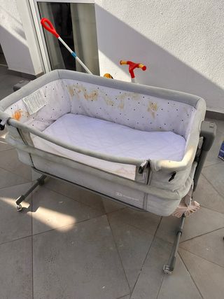 Cuna colecho para bebé con altura ajustable. Incluye capota con mosquitera. - Cinta de sujeción. - Colchón transpirable y lavable a máquina. - Cesta de almacenamiento. - 4 ruedas bloqueables con giro 360°. - Se le compro colchon adicional. ( se da con el ) - se da con sabanas ajustables al colchon