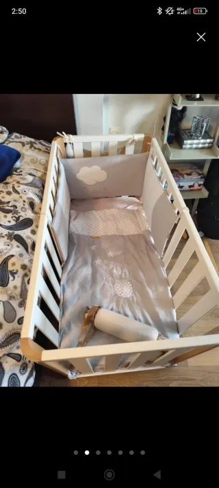 Cuna completa con colchón. 6 alturas y colecho. Protector de cuna y nórdico a juego reversibles y con relleno incluido 3 juegos de sábanas 2 de verano y uno de invierno. 2 protectores de colchón transpirables e impermeables. Todo de algodón. En perfecto estado. También se puede vender por separado. Consultar precio