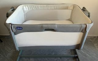 Cuna colecho chicco next2me. La baranda se baja automaticamente al pulsar el boton. Incluye colchon. Los defectos que presenta no impiden su uso. Defectos: tiene una rueda rota. Le falta el tirador de una cremallera. Tiene una pequeña picada en la malla