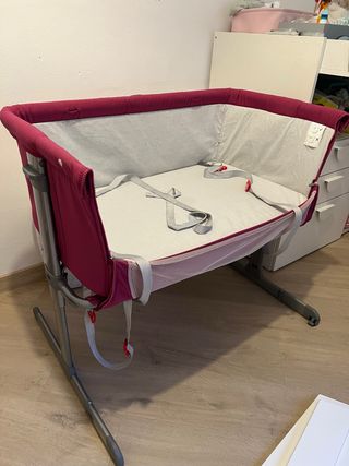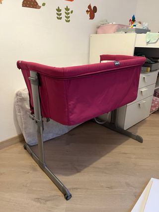 Cuna de colecho Chicco Next2Me en color rosa. Ideal para los primeros meses del bebé. - Colchón incluido. - Apertura lateral. - Altura ajustable. - Paneles de malla. - Ruedas para facilitar el movimiento. - Incluye bolsa de viaje. - Apta de 0 a 6 meses. - Peso máximo: 9 kg.