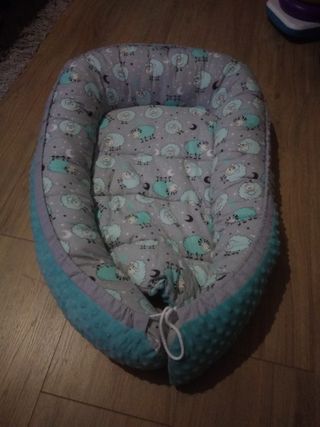 Nido reductor para bebé. Se puede usar como colecho o en cuna para dar al bebé una mejor sensación. - Funda con estampado de rallas y flores reversible. - Desenfundable para poder lavarlo mejor. - Lazos de tela para ajustar. Apenas se ha usado. Medidas en fotos.
