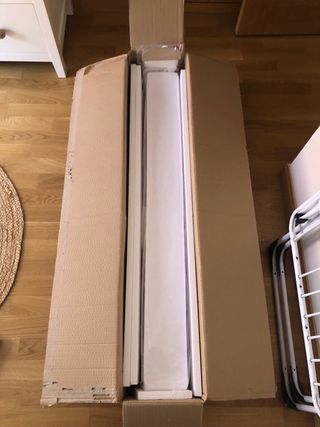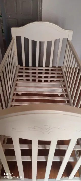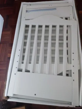 Cuna de la marca TRAMAS en buen estado. - Color blanco. - Diseño clásico y funcional. de colecho, se manda también con el cojín para ponerlo entre la cuna y la cama de matrimonio. Con colchón La foto no es exacta a la de la cuna, porque está ya desmontada, pero es muy parecida.