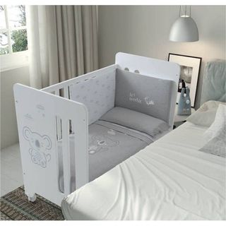 Nido de colecho con un adorable estampado de koalas grises sobre fondo blanco. Es suave y acogedor. - Diseño con estampado de koalas. - Tejido blanco con detalles grises. - incluye funda para guardarlo - con cuña antireflujo - cojín lactancia - 2 fundas, una de koalas y otra blanca -