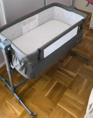 Cuna colecho con un diseño moderno y funcional, ideal para tener al bebé cerca. - Estructura de madera y textil. - Laterales de malla transpirable. - como nueva. El colchon es por separado, 70€ con colchon y 55€ solo la cuna, la cuna trae su propio colchón pero es super fino. Escucho ofertas👏🏻