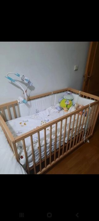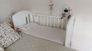 Cuna colecho que se convierte en cama montessori con las barreras que se ven en la tercera foto. La cuna tiene 5 alturas. Posibilidad de colchón, total 150. Precio original de la cuna 239 y del colchón 66 No se ha usado porque ha dormido con nosotros