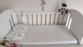 Cuna de colecho en color blanco. En muy buen estado, literalmente el bebe nunca ha dormido allí... Incluye una base de madera que compré aparte antireflujos (es elevable) y el colchón que me costó 250€ en canción de cuna y está sin usar.... La cuna no me acuerdo cuanto costó pero entorno a 300€. Incluye el móvil de cuna que valía 40€
