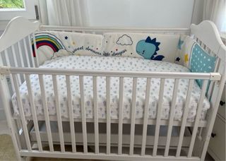 Cuna colecho lista para usar, incluye colchón y chichoneras. - Chichoneras con diseño de arcoíris y dragón. - Buen estado. Es de color blanco y tiene un cajón inferior para guardar cosas. El colchón está como nuevo, se puede ajustar en 5 alturas diferentes. Un lado se desliza bajo la cuna para hacerla colecho o se puede dejar para ser cuna independiente. Algunos arañazos pequeños y las ruedas se salen si no mueves con cuidado, pero se puede reparar fácil