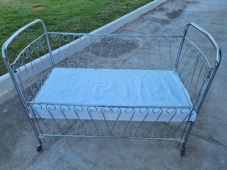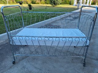 Cuna metalica para bebé con colchón de espuma. Se puede usar fija o en colecho. Con ruedas para moverla fácilmente. Medidas: 120cm x 60cm