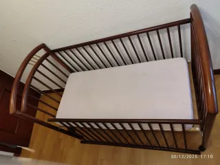 Cuna de madera oscura con un diseño curvo y barrotes verticales. Incluye colchón. - Estructura de madera. - El lateral puede ponerse que se suba y se baje o dejarle quitado para hacer colecho.