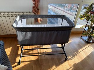 Cuna de colecho para bebé, en muy buen estado y con poco uso. Ideal para tener al bebé cerca durante la noche. - Color gris jaspeado. - Laterales de malla transpirable. - Estructura metálica con ruedas para fácil movilidad.