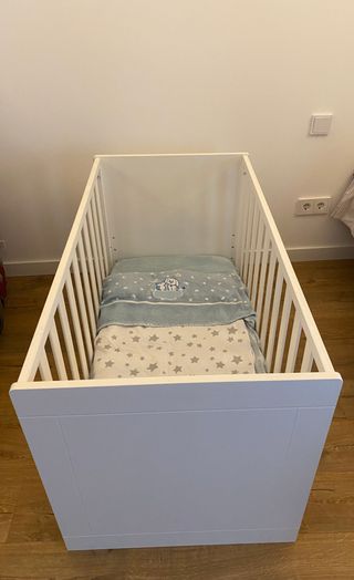 Cuna blanca de 60x120 cm, modelo Sundvik. Perfecta para el descanso del bebé. Se puede usar como cuna colecho. Algunas marcas de uso. - Estructura de madera. - Barreras de seguridad. - Instrucciones en la página web de Ikea. Muy fácil de montar. - Incluye colchón. Funda lavable con algunas manchas. - Incluye chichonera. Lavable. - No incluye ropa de cama. Desmontada. Incluye todas las piezas. Recogida en Peguera o en la Universidad (UIB).