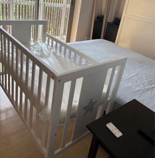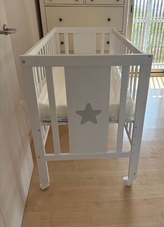 Cuna Babybay maxi. tamaño colchon 89x51cm Datos del fabricante: AJUSTABLE DE ALTURA SIN ESCALONES - Gracias a la alta construcción y al ajuste de altura individual, la cuna de colecho se adapta perfectamante a la cama sin dejar espacio entremedio, sin escalones y sin tambalearse, para que siempre tengas a tu bebé cerca de ti. FLEXIBLE - babybay® Maxi se puede fijar a la cama de los padres de forma segura y sin herramientas gracias al soporte de montaje ajustable. Gracias a la amplia zona de descanso, también es adecuado para gemelos. CONVERTIBLE DURADERO Y VERSÁTIL - babybay® crece contigo - La cuna colecho se puede convertir en un banco o en una mesa de juego en poco tiempo y con accesorios opcionales en un moisés o incluso una silla alta. MÚLTIPLES PRUEBAS Y PREMIOS - babybay® ha recibido múltiples premios de las principales revistas infantiles y especializadas. Las matronas y las asesoras de lactancia también recomiendan babybay® como la cuna de colecho ideal. babybay® estß, por supuesto, probado por TÜV. SOSTENIBLE Y SEGURO - babybay® soporta hasta 150 kg y se puede sujetar de forma segura a la cama de los padres gracias al accesorio especial. La madera de haya maciza y antibacteriana proviene de los bosques locales. Todas las pinturas estßn libres de sustancias nocivas y son resistentes a la saliva. Tiene una grieta porqué mi pareja se apoió cuando lo queríamos montar y la madera estaba mal puesta en el suelo. Pero la reforzamos y ya está. Viene con 3 sabanas originales.