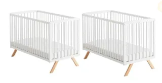 Cuna gemelar de diseño moderno y seguro. -Kit de colecho y colchones incluidos. - Estructura de madera blanca. - Patas de madera natural. - Somier de láminas de madera.