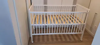 Comprado hace muy poco, tengo factura. Se ha montado pero no se ha usado. Incluye colchón y dos sábanas bajeras. Color: madera natural Material: haya maciza, sin tratar Superficie de reposo: ancho x largo 51 x 89 cm Medidas: 54 x 94 x 96,5 cm (ancho x largo x alto) Peso del producto: 18 kg Ajustable a cualquier altura Período de uso: hasta aprox. los 14 meses