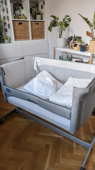 Minicuna Chicco next2me en perfecto estado, ideal para colecho. Es portátil y fácil de montar. - Estructura ligera 10kg y resistente. - Tejido suave y agradable al tacto. - Incluye colchón, funda viaje y caja original