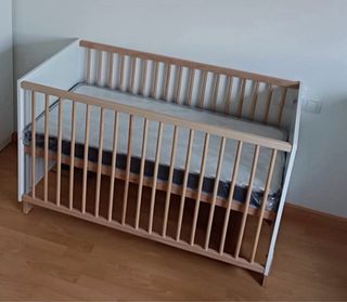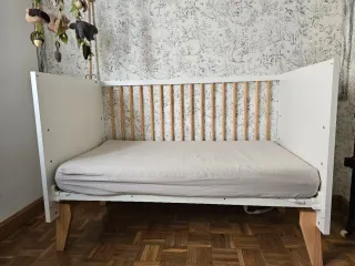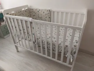 Cuna marca Trama + colchón ecus care. Tiene ligeros raspones en la pintura pero nada q impida su correcta utilización. La ruedas están cambiadas por unas mejores, silenciosas y con freno. 3 alturas de colchón y posibilidad de colecho.