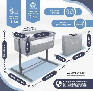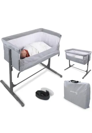 Minicuna colecho de la marca Baby Side, ideal para tener al bebé cerca durante la noche. Su diseño permite acoplarla fácilmente a la cama. - Estructura gris y blanca. - Incluye colchón y textiles. - Laterales de malla transpirable. Dispone de una amplia ventana frontal y en los laterales para vigilar al bebé con facilidad y sin necesidad de levantarte. La función colecho es compatible con todo tipo de camas aunque también la podrás usar como cuna independiente. Gracias a sus distintas posiciones de elevación independiente por cada lado, podrás regular la altura de la cuna y también inclinarla por un solo lateral.