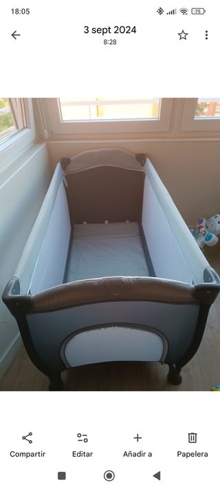 Cuna de viaje que se pliega y lleva su funda para transportar, se puede dejar fija si también se quiere.