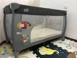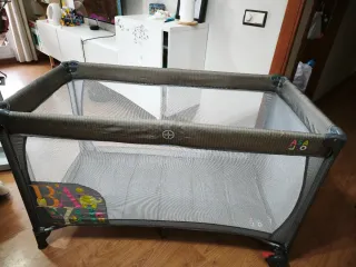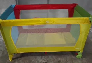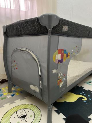 Cuna de viaje en color gris con un divertido estampado de estrellas y lunares de colores. También sirve cómo parque infantil. Con libro de instrucciones y caja original. - SIN el cambiador - Incluye móvil con estrellas colgantes. - Laterales de malla para ventilación. - Barras de sujeción de colores. - Con ruedas para fácil desplazamiento y frenos. Entrega también posible por zona Vilanova y la Geltrú.