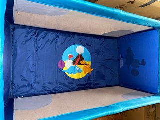 Cuna de viaje plegable de la marca Asalvo, con un divertido diseño de piratas y el mar. - Color azul. - Plegable para facilitar su transporte y almacenamiento. - Laterales de malla para ventilación. -Incluye base acolchada. -Dimensiones abierta: 120x60x60 -Dimensiones plegada: 76x20x20