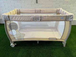 Cuna de viaje de la marca Asalvo, ideal para transportar y usar en diferentes lugares. Su diseño es práctico y funcional. - Estructura resistente. - Laterales de malla para ventilación. - Ruedas para facilitar el movimiento. - Gatera lateral. Cuenta con cambiador, móvil y doble altura. Se regala colchón de viaje.