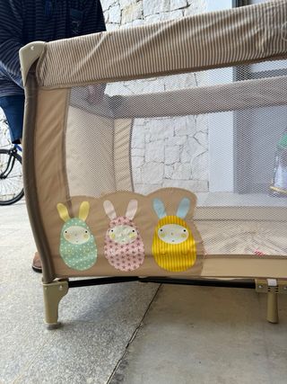 Cuna de viaje de la marca Asalvo con un adorable diseño de conejitos. - Laterales de malla transpirable. - Estructura resistente y estable. - Ruedas para facilitar el desplazamiento.