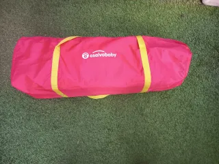 Minicuna de viaje plegable Asalvo, ideal para llevar a todas partes. Su diseño permite un montaje y desmontaje rápido. - Estructura de metal. - Tejido de malla transpirable. - Incluye mosquitera. - Como se observa en una foto hay que darle una puntada para que no se salga una de las varillas. - Tiene funda para transporte
