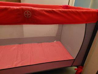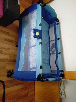 Cuna de viaje de doble altura y cambiador, bolsillo lateral y salida. Tiene un pequeño agujero en la malla lateral.