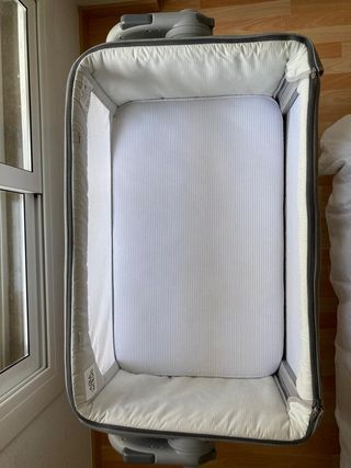 Cuna que permite realizar colecho y en perfecto estado. Dispone de: - 6 niveles. Permite la inclinación para una mejor digestión o en caso de congestión nasal. - Pies retráctiles para adaptarse mejor a la cama. - 2 cintas para asegurar la cuna con la cama. - El colchón y una bajera del colchón. - Funda de viaje (se entregará en ella)