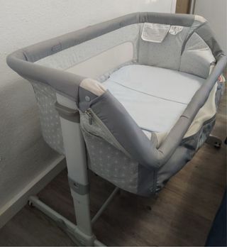 Cuna colecho marca Chicco next2me. En buen estado. Con ajuste de altura y de inclinación. Patas con opción de balanceo y ajustables a canapé. Fácilmente plegable para usar como cuna de viaje, aunque la funda está rota del asa.