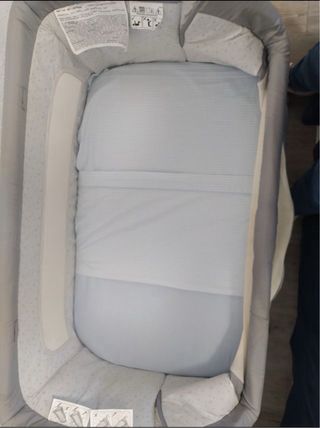 Minicuna chicco Next2Me Magic evo, evolución de la anterior, con barrera lateral que se puede abrir y cerrar con una sola mano, compatible con la mayoría de las camas gracias al ajuste de altura de 11 niveles y a las patas articuladas y plegables. Fijación con correas. En caso de regurgitación o congestión nasal, la cuna puede inclinarse. El colchón incluido es transpirante, y está equipada con 4 ruedas con frenos que la hacen muy fácil de mover. Además también incluyo la bolsa de viaje. Todo prácticamente nuevo porque el bebé prefería estar en la cama con nosotros 😵💫