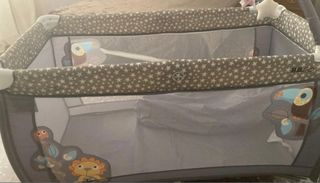 Cuna de viaje en color gris, prácticamente nueva. Su diseño permite un montaje y desmontaje sencillos, tiene dos alturas que se ajustan a la edad y necesidades del bebé. Cambiador para recién nacido con correas de sujeción. - Estructura resistente. - Laterales de malla transpirable. - Puerta con cremallera. - Colchón enrollable.