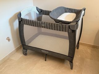 Cuna de viaje de la marca Graco, ideal para los más pequeños. Incluye un práctico cambiador, colchon de 95x45 y una sabana bajera. - Diseño en color gris con detalles a rayas. - Laterales de malla para ventilación. - Ruedas para facilitar el desplazamiento.