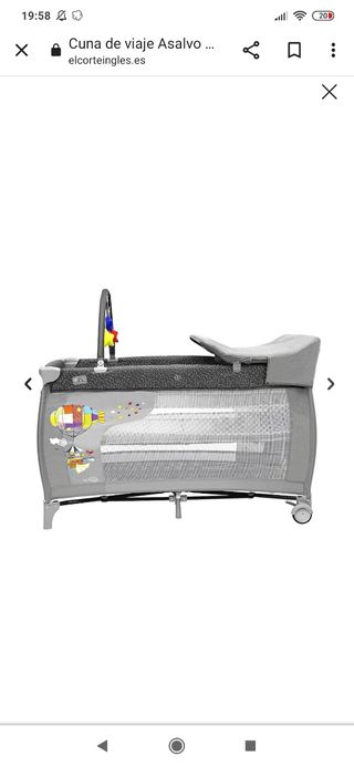 Cuna de viaje marca asalvo. tono marrón claro con dibujos de letras. Cuna con doble altura y sistema de cremallera. Incluye: base acolchada de 120x60cm, un arco de juego con 3 juguetes, un cambiador, bolsillos para toallitas, pañales etc,,, un elevador para ajustar la altura(barras desmontables), una bolsa de viaje. Dispone dos ruedas con freno. Tiene una zona descosida que no impide funcionamiento ver última foto