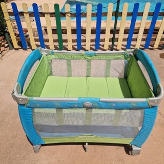 Cuna de viaje, marca Graco, con unas medidas de 100x70 cm. Ideal para habitaciones donde no cabe una cuna estandar de 120cm. El sistema de apertura y cierre es fabuloso, no como otras marcas que se bloquean y dan muchos problemas. Es de muy buena calidad. Regalo colchón a medida con funda con cremallera lavable. La cuna se ha usado sólo como cuna permanente durante dos años, siempre con el colchón, nunca como parque de juegos. Está practicamente nueva, limpia, con embalaje original. A mí me ha valido hasta que el niño ha tenido 3 años. Como cuna de viaje es mejor que todas las demás, el colchoncillo que trae es muy mullido.