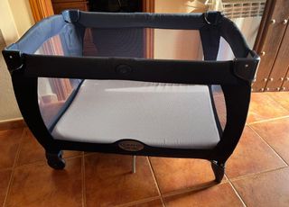 Cuna de viaje plegable de la marca Graco. Incluyo también colchón de viaje adaptable. Ideal para segunda vivienda o para tenerla en casa de familiares. - Color azul marino. - Logo de la marca visible.