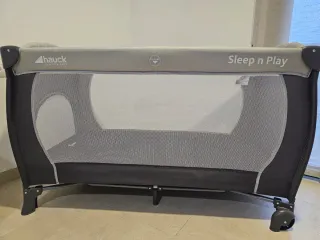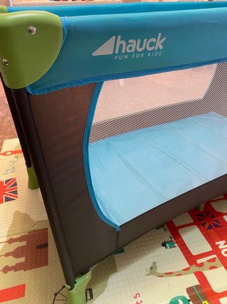 Cuna de viaje Hauck modelo Sleep n Play, ideal para bebés y niños pequeños. Fácil de montar y transportar. La funda del colchon tiene un agujero pero el colchón está perfecto - Diseño plegable. - Laterales de malla para ventilación. - Ruedas para movilidad.