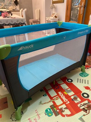Cuna de viaje Hauck modelo Dream n Play. En muy buen estado de conservación, prácticamente sin uso, se entrega con un colchón de calidad valorado en unos 70 euros apenas sin uso también. - Color azul y negro. - Laterales de malla para ventilación. - Estructura plegable para fácil transporte.