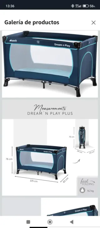 Cuna de viaje Hauck Dream n Play Plus en color azul marino. - Medidas desplegada: 125 cm (largo) x 65 cm (ancho) x 76 cm (alto). - Medidas plegada: 24 cm x 25 cm x 76 cm. - Peso: 9,2 kg. - Sistema de plegado rápido. Usada dos veces