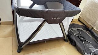 Cuna de viaje plegable Nuna SENA en color gris, con todos los accesorios. - Colchón grueso extra con cubrecolchón y sábana bajera. - Cambiador. - Red anti mosquitos. - Doble altura. Se puede utilizar de parque.
