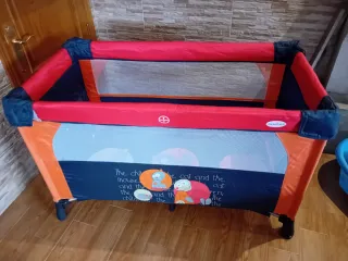 Cuna de viaje de Olmitos. Puede usarse como parque de juegos, dejando la puerta lateral abierta o cerrada, o como cuna de viaje. Tiene dos alturas para la cuna. Se incluye la base para las dos altura y un colchón fino, el que venía con la cuna. Está en buen estado salvo por las manchas que aparecen en el lateral que aparecen en las fotos.