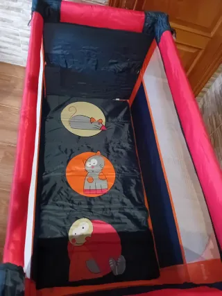 Cuna de viaje plegable de la marca Olmitos. Es compacta y fácil de transportar. CON COLCHÓN VISCOLASTICA NUEVO - Color naranja. - Estructura con detalles en verde y rojo. SIN USO PRACTÍCAMENTE cuna bebé