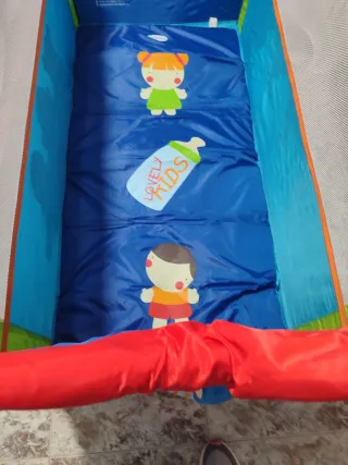 Cuna de viaje con un diseño alegre y colorido, ideal para los más pequeños. Presenta ilustraciones de niños y un biberón. - Estructura de metal y tela. - Laterales de malla transpirable. - Colchoneta azul con dibujos. Incluye colchón plegable azul oscuro. La cuna está prácticamente nueva.