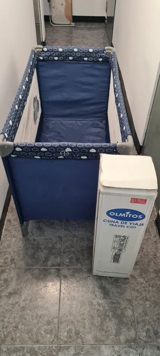 Cuna de viaje de la marca OLMITOS, en perfecto estado y con muy poco uso. - Color azul. - Incluye bolsa de transporte. - Ruedas para facilitar el desplazamiento.