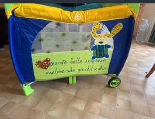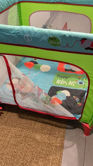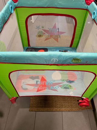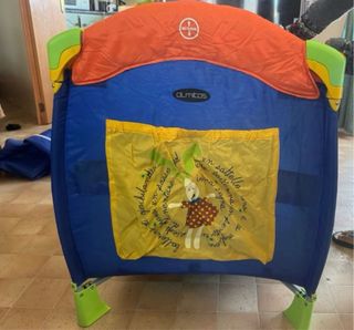 Cuna de viaje de la marca Olmitos, con un diseño colorido y divertido. - Estructura plegable. - Laterales de malla transpirable. - Incluye bolsa de transporte. Usada dos veces. Como nueva. Sirve tambien como parque. Incluye colchon.